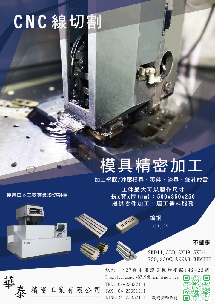 華泰精密工業有限公司使用日本三菱專業線切割機,可提供零件加工、連工帶料服務。線切割加工,加工塑膠/沖壓模具、零件、治具、細孔放電
